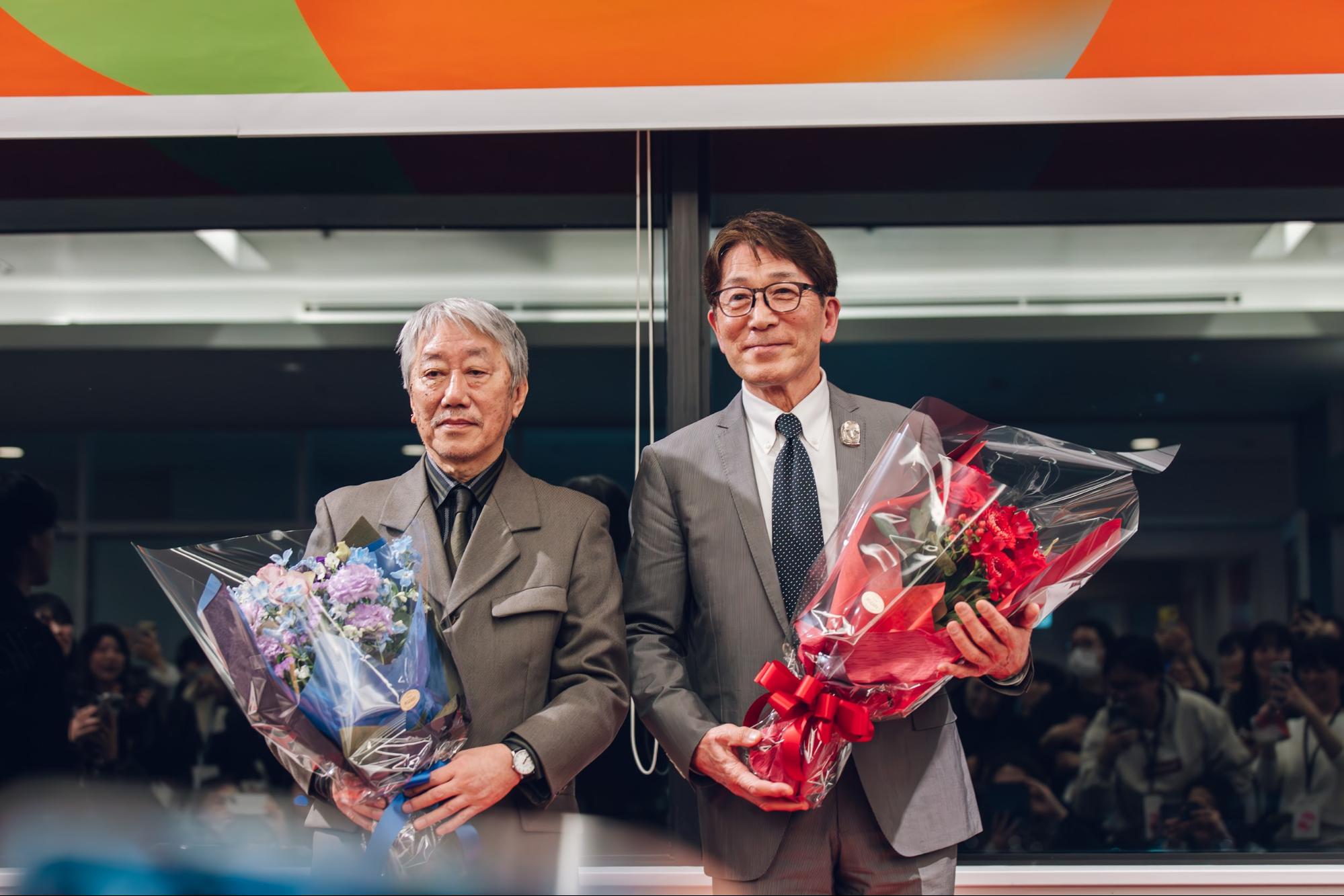 そして、コロナ禍で直接お祝いが叶わなかった髙島直之先生(2022年退任)と楫義明先生(2021年退任)への感謝のセレモニーも。ゼミ生たちに囲まれ、花束を受け取る先生方の笑顔に、会場は大きな拍手に包まれました。