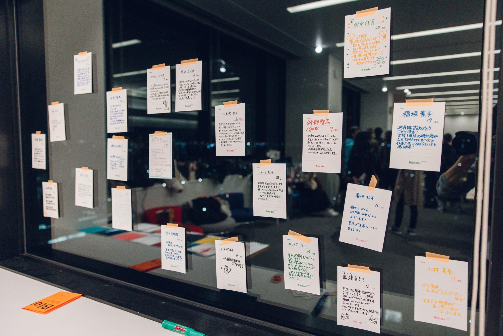 山崎栞奈さん(17期)による実況中継では、第一部で集まったメッセージを紹介。芸文での思い出や、未来の芸文生へのエールなど、温かい言葉がボードを彩ります。